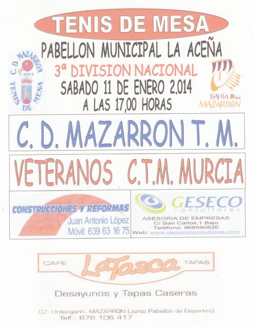 Este sábado regresa la competición ligera en tenis de mesa con el encuentro entre el C.D Mazarrón T.M. y el Veteranos Murcia