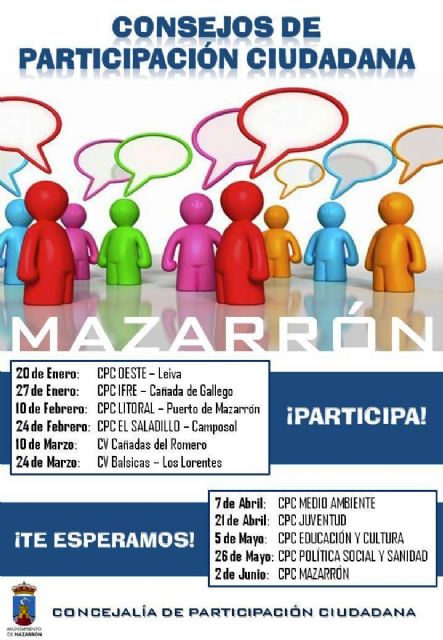 El lunes 10 de febrero tendrá lugar en la biblioteca de Puerto de Mazarrón, sita en la avenida Costa Cálida, el CPC LITORAL que enmarca a los núcleos poblacionales del Puerto, Bolnuevo y el Alamillo. Dos semanas después, el lunes 24, se celebrará el CPC SALADILLO que, en principio, se desarrollará como viene siendo habitual en el centro social de Camposol y al que están llamados los vecinos de esta urbanización, así como del Saladillo y de Country Club.