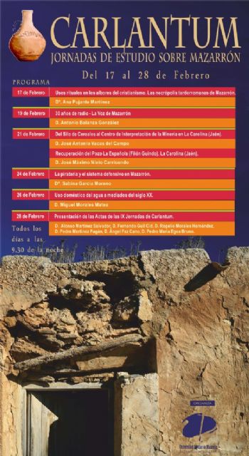 Este lunes 17 de febrero arrancarán las XII jornadas de estudio 'Carlantum' que, una vez más y como es habitual, abrirán un espacio de reflexión sobre temas que tienen que ver con el municipio de Mazarrón. Las jornadas, que se desarrollarán del 17 al 28 del presente mes, fueron presentadas por el Alcalde de Mazarrón, Ginés Campillo, y el director de la Universidad Popular de Mazarrón, José María López Ballesta. Éste explicó que "las diferentes ponencias están abiertas a todo el público y tendrán lugar en el salón de actos del CIME (antigua universidad popular) a partir de las 21:30 horas".