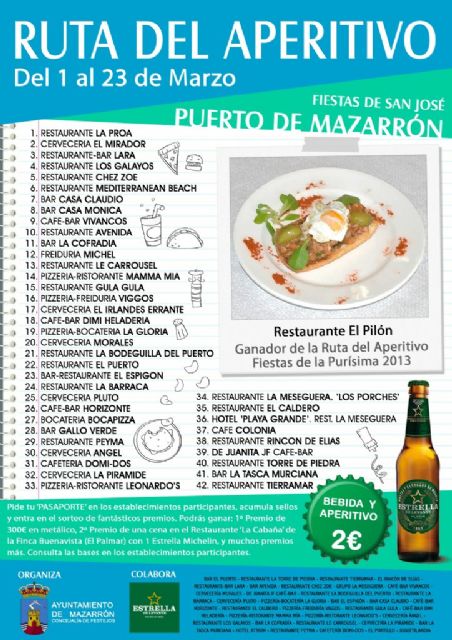 Del 1 al 23 de marzo la concejalía de Festejos celebra la 'Ruta del Aperitivo' de las fiestas en honor a San José de Puerto de Mazarrón. 42 establecimientos del Puerto, Alamillo, Playagrande y Bolnuevo; participan en esta ruta que llevará a los paladares de los vecinos y turistas deliciosas tapas, más cerveza, vino o refresco; al precio de 2 euros. Así lo dieron a conocer ayer el Alcalde de Mazarrón, Ginés Campillo, el concejal de Festejos, Isidro Coy, y el responsable del área, José Baltasar.