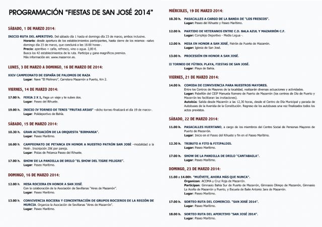 El domingo 16 de marzo, a las 12 horas habrá una misa rociera en la plaza de las Comunidades Autónomas y posterior convivencia rociera con la concentración de grupos rocieros de la Región de Murcia, la cual organiza la Asociación Rociera 'Aires de Mazarrón'. Los actos se retoman el miércoles 19 de marzo, día de San José, con un pasacalles a partir de las 10:30 horas a cargo de la banda 'Los Frescos', lo que es otra de las novedades de este año. A las 12 horas se celebrará la misa en honor al patrón en la iglesia de San José con posterior procesión por las calles de la localidad costera. También a mediodía el complejo deportivo de la Media Legua acogerá un partido entre los veteranos del C.D. Bala Azul y Mazarrón C.F. Ese día también se celebrará II Torneo de Fútbol Playa 'Fiestas de San José' que comenzará, previsiblemente, a las 10 horas y se disputará en la playa de La Reya (Bahía Grande).