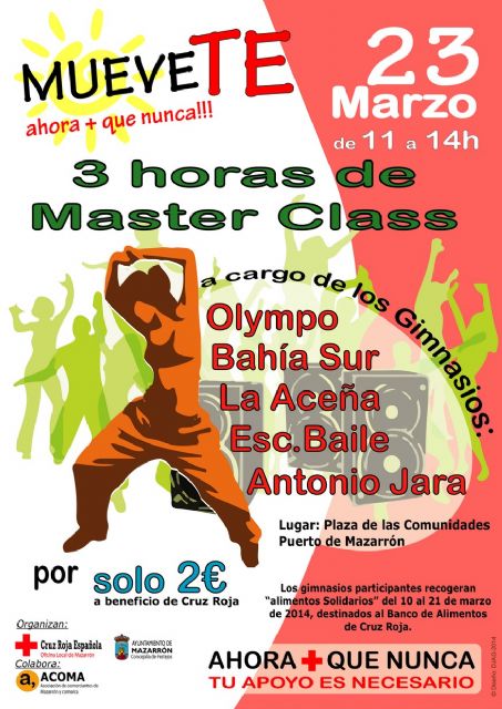 Los actos finalizarán el domingo 23 de marzo con la actividad organizada por Cruz Roja Mazarrón 'Muévete, ahora más que nunca' y la entrega de premios de la 'Ruta del Comercio' y la 'Ruta del Aperitivo' a las 17 y 18 horas respectivamente. Carmen Navarro explicó que la actividad 'Muévete, ahora más que nunca' se celebrará en la plaza de las Comunidades Autónomas de 11 a 14 horas. "Por tan sólo 2 euros que irán dedicados a la actividad de refuerzo escolar y merienda que ofrece 'Cruz Roja', los participantes pueden realizar todas las coreografías que llevarán a cabo los gimnasio 'bahía Sur', 'Olimpo', 'La Aceña' y la escuela de baile 'Antonio Jara'", indicó Navarro quien añadió que "además, todos aquellos que lo deseen, podrán llevar a los gimnasios o al paseo del Puerto un kilo de comida para ayudar a familias necesitadas".