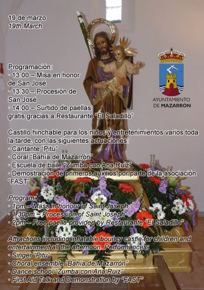 A partir de las 14 horas, y gracias al restaurante 'El Saladillo', habrá surtido de paellas gratis para todos los asistentes. Asimismo, habrá un castillo hinchable para el disfrute de los más pequeños y diversas actuaciones a lo largo de la tarde como serán las del cantante 'Pitu', la coral 'Bahía de Mazarrón', la escuela de baile 'Zumba con Ana Ruiz', así como una demostración de primeros auxilios por parte de la asociación de residentes extranjeros 'FAST'.