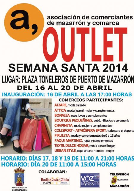 Del 16 al 20 de abril, la plaza de Toneleros en Puerto de Mazarrón se convertirá en un gran espacio para las compras con la celebración de una feria 'outlet' organizada por la Asociación de Comerciantes de Mazarrón y Comarca (ACOMA), con la colaboración de la concejalía de Comercio del Ayuntamiento de Mazarrón. La cita fue presentada por el concejal de Comercio, David Fernández, y la presidenta de ACOMA, Paqui Madrid, quienes se mostraron muy contentos de poder sacar adelante por primera vez este proyecto.