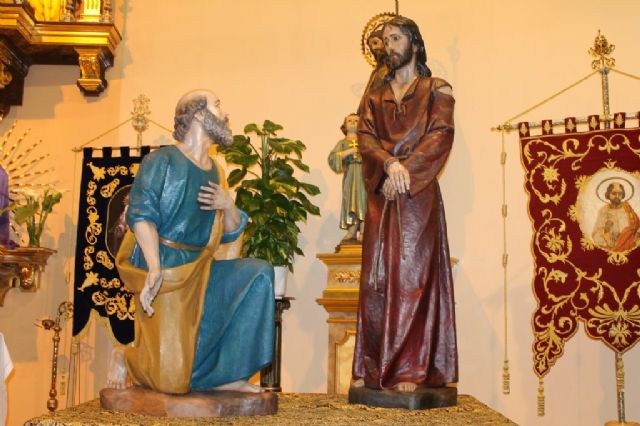 Una sorpresa aguardaba ayer a los fieles que acudieron para escuchar el pregón de la Semana Santa de Puerto de Mazarrón a la iglesia de San José. El altar estaba presidido por dos nuevas tallas del escultor José Hernández Navarro que desfilarán este Jueves Santo por las calles de la localidad costera. Como explicó el propio autor, "se trata de las imágenes de Cristo y San Pedro que se encuentran después de que el apóstol haya negado a su maestro tres veces". Dichas imágenes procesionarán sobre un nuevo trono que ha sido realizado por Manuel Ángel Lorente.