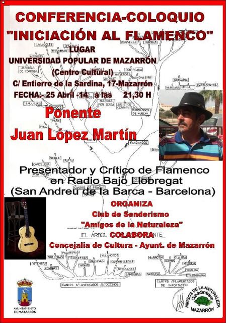 Este viernes 25 de abril se celebra en el Centro Cultural de Mazarrón una conferencia-coloquio titulada 'Iniciación al Flamenco'. La charla correrá a cargo de Juan López Martín, quien es presentador y crítico de flamenco en Radio 'Bajo Llobregat', y comenzará a las 21:30 horas. La actividad ha sido organizada por el club de senderismo 'Amigos de la Naturaleza' y cuenta con la colaboración de la concejalía de Cultura del Ayuntamiento de Mazarrón