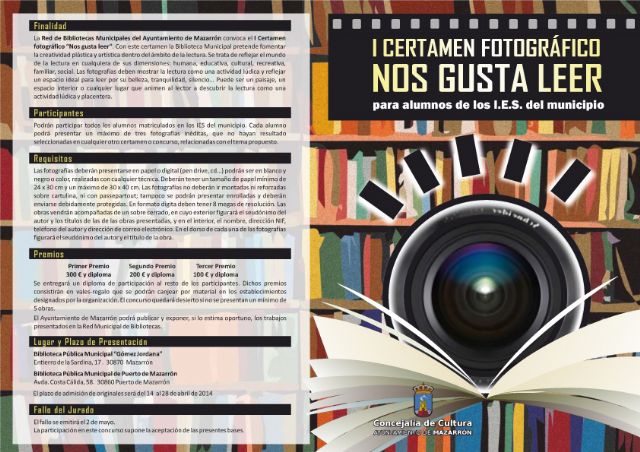 La concejalía de Cultura del Ayuntamiento de Mazarrón, a través de la Red Municipal de Bibliotecas, ha convocado el I Certamen fotográfico 'Nos gusta leer'. Con este certamen se pretende fomentar la creatividad plástica y artística dentro del ámbito de la lectura, tratando de reflejar el mundo de la lectura en cualquiera de sus dimensiones: humana, educativa, cultural, recreativa, familiar, social. Las fotografías deben mostrar la lectura como una actividad lúdica y reflejar un espacio ideal para leer por su belleza, tranquilidad, silencio… Puede ser un paisaje, un espacio interior o cualquier lugar que animen al lector a descubrir la lectura como una actividad lúdica y placentera.