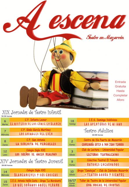 La Universidad Popular (UP) del Ayuntamiento de Mazarrón ha comenzado a celebrar esta semana las XIX Jornadas de Teatro Infantil y las XIV Jornadas de Teatro Juvenil encuadradas dentro de la programación teatral 'A Escena', que también cuenta con teatro de adultos, y que se desarrolla durante el mes de mayo en el salón de actos de la UP, situado en el edificio del Centro de Iniciativas Municipales de Empleo (CIME) de la avenida de la Constitución de Mazarrón. La entrada a todas las representaciones es gratuita hasta completar aforo.