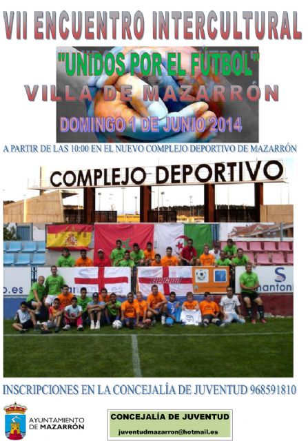 El próximo domingo 1 de junio el Complejo Deportivo de la Media Legua acogerá la celebración del VII Encuentro Intercultural 'Unidos por el fútbol' Villa de Mazarrón que organiza la concejalía de Juventud del Ayuntamiento de Mazarrón. El concejal delegado y el técnico del área, Andrés Valera y Francisco Sáez, dieron cuenta de esta actividad a la que los jóvenes de entre 14 y 35 años pueden apuntarse en el 'Informajoven' situado en el pabellón de deportes 'La Aceña', a través del teléfono 968 59 18 10 o del correo electrónico juventudmazarron@hotmail.es .