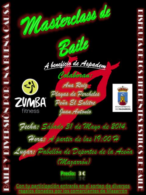 Mazarrón mostrará de nuevo este sábado 31 de mayo su cara más solidaria con una actividad organizada a beneficio de la Asociación de Padres de Personas con Discapacidad Intelectual de Mazarrón (ASPADEM) y en la colabora el Ayuntamiento de Mazarrón. En esta ocasión se trata de una cita para los amantes del baile ya que el pabellón de deportes de 'La Aceña' acogerá una 'Masterclass de Baile' a partir de las 19 horas.