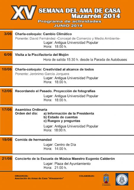 Este martes 3 de junio arranca la XV edición de la 'Semana del Ama de Casa' que organizada la Asociación de Amas de Casa, Consumidores y Usuarios 'Almazarrón' con la colaboración del Ayuntamiento de Mazarrón y la Asociación Musical 'Maestro Eugenio Calderón'. La programación comienza con una charla de concejal de Medio Ambiente del consistorio mazarronero, David Fernández, sobre cambio climático. Será este martes a partir de las 18 horas en el salón de actos del CIME (antigua Universidad Popular).