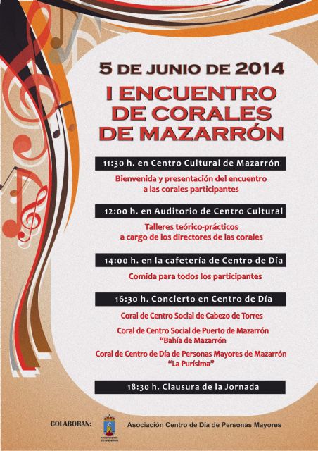 Mazarrón celebra este jueves 5 de junio el I Encuentro de Corales de Mazarrón en el que participarán la coral 'La Purísima' del Centro de Día de Personas Mayores de Mazarrón, la coral 'Bahía de Mazarrón' del Centro Social de Mayores de Puerto de Mazarrón y la coral del Centro Social de Mayores de Cabezo de Torres (Murcia). La jornada, organizada por la concejalía de Política Social del Ayuntamiento de Mazarrón con la colaboración de la Asociación del Centro de Día, se llevará a cabo en el Centro Cultural y en el propio centro de los mayores.