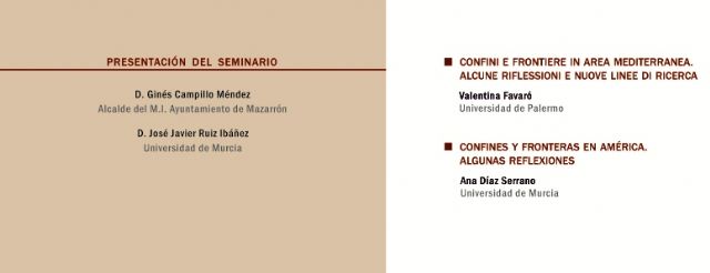 Este viernes 6 de junio el Centro Cultural de Mazarrón acogerá el II Seminario Internacional Permanente de Estudios sobre las Fronteras de los Mundos Ibéricos y Mediterráneos. A partir de las 16:30 horas, están previstas dos ponencias que impartirán Valentina Favaró de la Universidad de Palermo, quien hablará sobre los 'Confini e frontiere in area mediterránea. Alcune riflessione e nuove linne de ricerca' (Límites y Fronteras en el área mediterránea. Algunas reflexiones y nuevas líneas de investigación); y Ana Díaz Serrano de la Universidad de Murcia, que centrará su intervención en 'Confines y fronteras en América. Algunas reflexiones'.