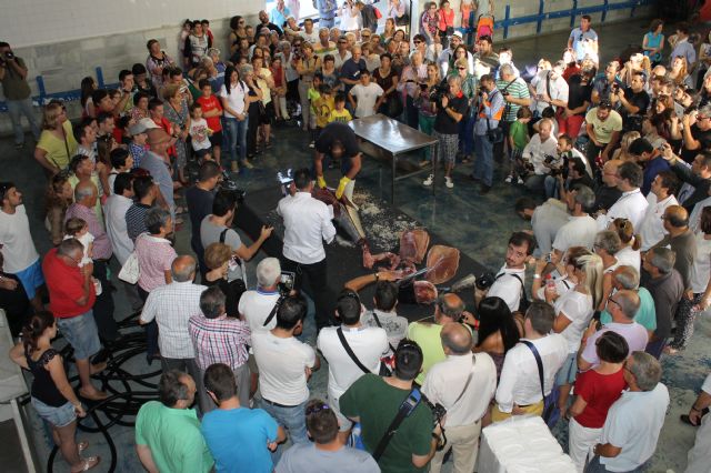 Esta tarde han comenzado las I Jornadas del Atún Rojo de Mazarrón que han obtenido una excelente acogida por parte del numerosísimo público que no ha querido perderse los primeros 'show cookings' de esta cita con la gastronomía y, especialmente, el 'ronqueo' de un atún rojo de 130 kilos que se ha llevado a cabo en la lonja del puerto pesquero de Puerto de Mazarrón.