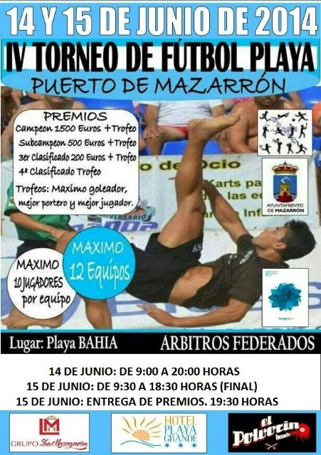Este fin de semana, 12 equipos participan el IV Torneo de Fútbol Playa que se celebrará en la playa de La Reya (Bahía Grande). La cita deportiva, en la que colabora la concejalía de Deportes del Ayuntamiento de Mazarrón, comenzará el sábado a las 9 de la mañana, prolongándose ese día hasta las 8 de la tarde. El domingo 15 se disputará la segunda jornada que comenzará a las 9 y media de la mañana, disputándose la final a partir de las 6 y media de la tarde.