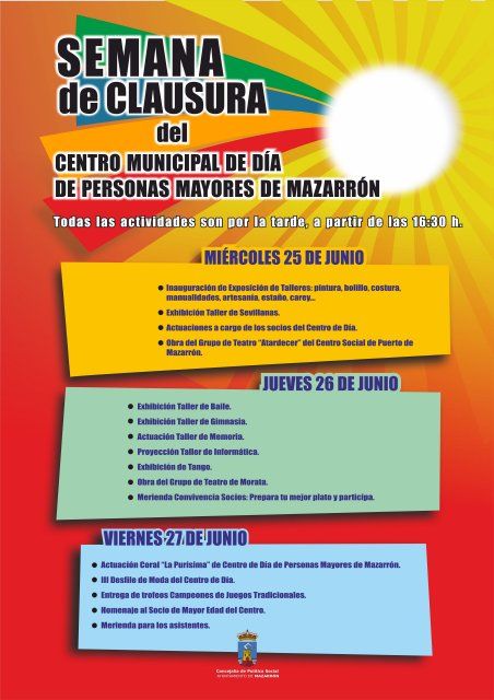 El programa de clausura celebrará el viernes su último día con la presencia de las autoridades municipales. Ese día actuará la coral La Purísima y se celebrará el III Desfile de Moda del Centro de Día. Con la entrega de trofeos y el homenaje al socio de mayor edad se pondrá fin al acto.