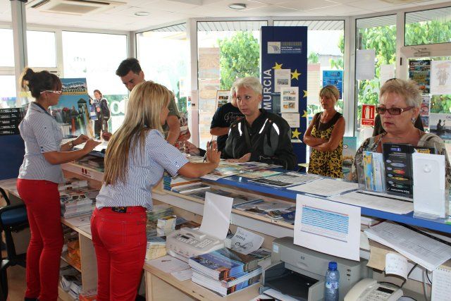 Un stand con material de playa y moqueta azul, para evocar el mar, servirá de escenario principal desde el que se comunicará a vecinos y visitantes las iniciativas turísticas que se llevarán a cabo, durante los dos próximos meses, en nuestro municipio.