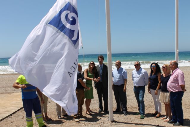 El consejero de Industria, Turismo, Empresa e Innovación, Juan Carlos Ruiz, acompañado del alcalde de Mazarrón, Francisco García, y la directora del Instituto de Turismo, Mariola Martínez, ha izado hoy la bandera azul, la de la Q de Calidad y la de Ecoplaya en la playa del Castellar de Mazarrón.