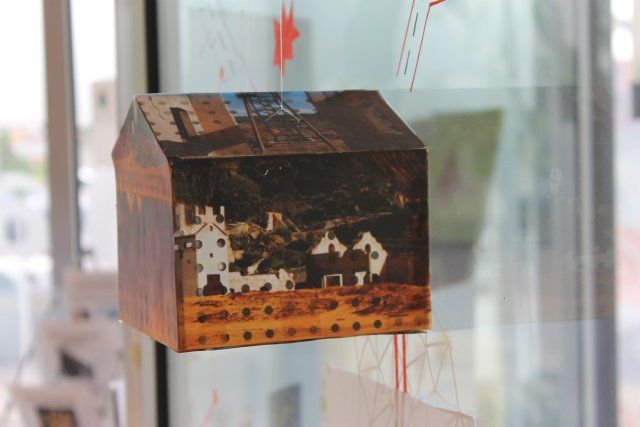 La muestra que alberga la oficina de Puerto de Mazarrón pertenece a Ana Martínez quien a través del objeto y el dibujo crea un mapa de algunos de los paisajes más característicos de nuestro municipio. Para ello utiliza la casa como símbolo de aquello que tiene que ver con el hombre y con lo creado a partir de lo natural. Casas que flotan, que vuelan, ancladas, con raíces… arquitecturas que mimetizan con el paisaje.