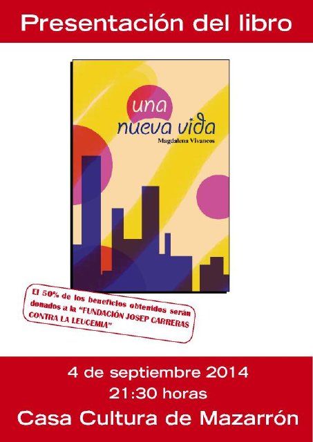 Más tarde, a las 21:30 horas, el Centro Cultural de Mazarrón acoge la presentación de una obra autobiográfica. "Una nueva vida" de Magdalena Vivancos relata la historia de superación de una familia tras el diagnóstico de leucemia de uno de sus hijos. La publicación ha sido editada por Diego Marín y ya está disponible para su adquisición en la tienda on line de este librero-editor. El libro también se podrá adquirir, en formato impreso, en algunos comercios de Mazarrón. El 50% de los beneficios de la venta serán donados a la Fundación Josep Carreras contra la Leucemia.