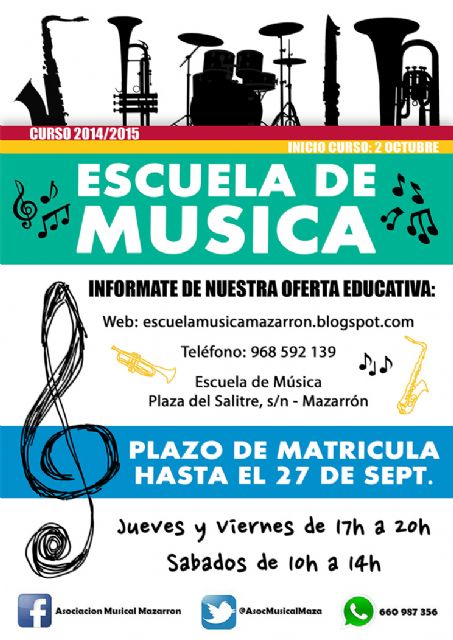 Durante el mes de septiembre, la Escuela de Música de Mazarrón tiene abierto el plazo de matrícula de cara al curso 2014/2015, cuyas clases comenzarán el próximo 2 de octubre.
