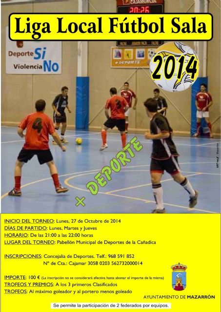 El Pabellón Municipal de Deportes de La Cañadica acoge una nueva edición de la Liga Local de Fútbol Sala. Se celebrará los días 27, 28 y 30 de octubre.