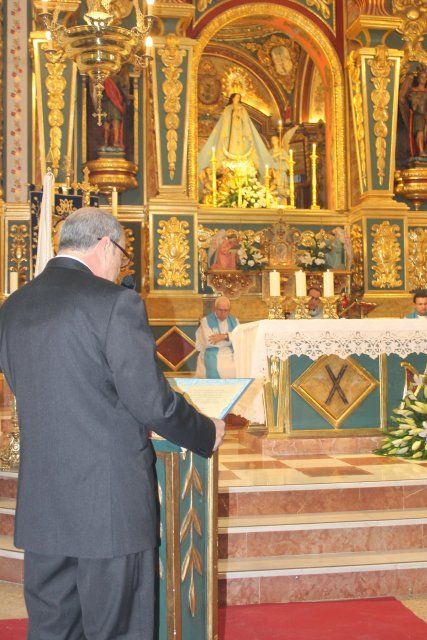 Los mazarroneros han renovado este lunes el voto a su patrona. Lo han hecho a través de las palabras del alcalde de Mazarrón, Francisco García, quien ha cumplido con la tradición de dar lectura al texto que oficializa este acto. Ha sido como de costumbre en el Santuario de la Purísima de Mazarrón durante una Santa Misa que ha oficiado el párroco de las iglesias de San Antonio y San Andrés, Julio Romero.