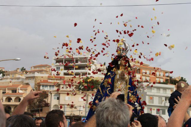 Un almuerzo servía para reparar fuerzas y seguir con la marcha. Ya cerca de Bolnuevo en la cuesta de la discoteca Zaira, parada y pétalos de rosas pare embellecer la imagen. Muchos turistas de diferentes nacionalidades aprovechaban la ocasión para captar el momento con cámaras y dispositivos móviles. Ya muy cerca de su santuario y frente al camping, nueva parada y ofrecimiento a la Virgen de bebés con escasos meses. En la avenida Juan de Borbón el trono era bailado y levantaba los aplausos de las personas que abarrotaban ambos lados de la carretera. Cerca de las Gredas el trono giraba hacia el paseo marítimo de Bolnuevo donde los costaleros descansaron apoyando la imagen e iniciando una serie de nuevos estribillos que aumentaron el fervor. Finalmente Misa y traslado hasta el Santuario de Bolnuevo donde la imagen reposará hasta el próximo año cuando sea de nuevo subida a Mazarrón. Junto al Alcalde de Mazarrón, Francisco García, el Secretario General de los socialistas murcianos, Rafael González Tovar, quien también quiso asistir al evento.
