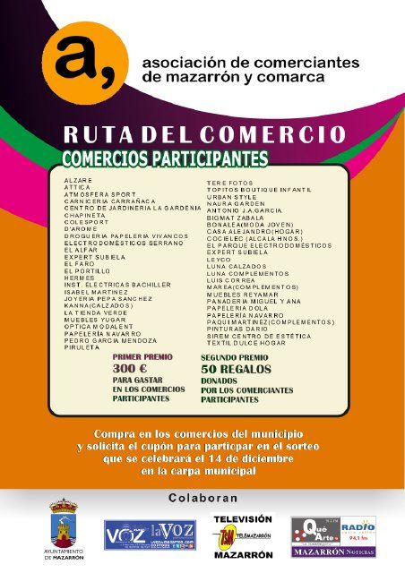 Hasta el 13 de diciembre los mazarroneros que hagan sus compras en los establecimientos adheridos a la Asociación de Comerciantes participarán en un sorteo de 300 euros y de 50 regalos. Dicho sorteo tendrá lugar el domingo 14 de diciembre en la carpa municipal instalada en la Plaza del Convento de Mazarrón. El cliente tendrá que hacer al menos seis compras en comercios distintos y rellenar un boleto que dará derecho a participar en el sorteo. Los 300 euros del primer premio serán empleados en compras en los establecimientos locales.