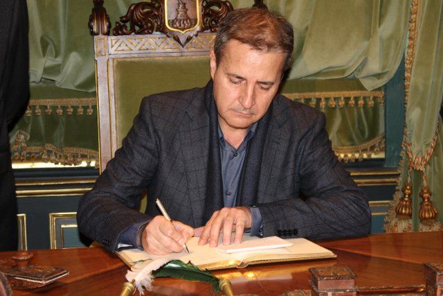 Acompañado de sus dos hijas, el artista llegó al Salón de Plenos de las Casas Consistoriales donde fue recibido por el alcalde, Francisco García, y otros miembros de la corporación municipal. Ocupando el lugar principal firmó en el Libro de Honor del Consistorio leyendo más tarde su dedicatoria. Seguidamente y como marca el protocolo se dirigió al Centro Parroquial flanqueado por las tres banderas institucionales portadas por representantes de Cáritas y Cruz Roja.