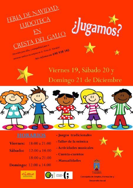 Mientras los mazarroneros realicen sus compras podrán dejar a sus niños para que participen en una ludoteca que incluirá juegos tradicionales, taller de mímica, actividades musicales, cuentacuentos y manualidades. El horario de la ludoteca será el viernes 19 de 18:00 a 21:00 horas, el sábado 20 de 12:00 a 14:00 y de 18:00 a 20:00 y el domingo 21 de 12:00 a 14:00 horas.