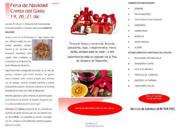 El próximo fin de semana la plaza de abastos Cresta del Gallo de Mazarrón acoge la I Feria de Navidad organizada por las concejalías de Comercio y Desarrollo Local en colaboración con la Asociación de Comerciantes de Mazarrón y Comarca (ACOMA). Ocho comercios se unen a los ya existentes en este lugar ocupando los puestos vacíos y ofreciendo así sus productos dentro de un ambiente navideño.