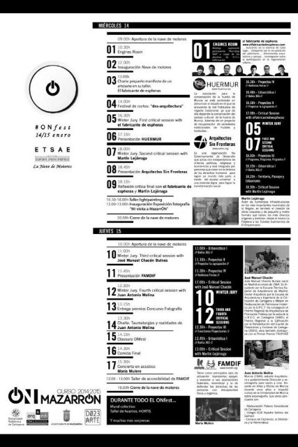 La Nave de los Motores abrirá sus puertas el miércoles 14 de enero a las 09:00 y hasta las 20:00 horas. El jueves 15 abrirá a las 10:00 y cerrará a las 18:00 horas. Entidades y asociaciones como Huermur, Famdif y Arquitectos Sin Fronteras participan en unas jornadas culturales que aglutinan música, un festival de cortos y diversas charlas relacionadas con la Arquitectura.