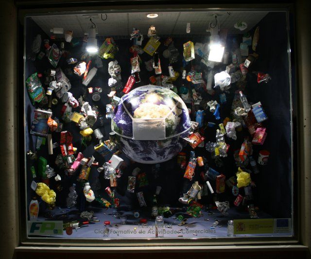 Para la ocasión los alumnos del ciclo formativo de Actividades Comerciales, integrado en el proyecto regional FP Dual, han mostrado un escaparate que escenifica un globo terráqueo, con forma de emoticono, rodeado de basura. Se trata de una actividad con la que los alumnos quieren incidir en la necesidad y en la importancia del reciclaje.