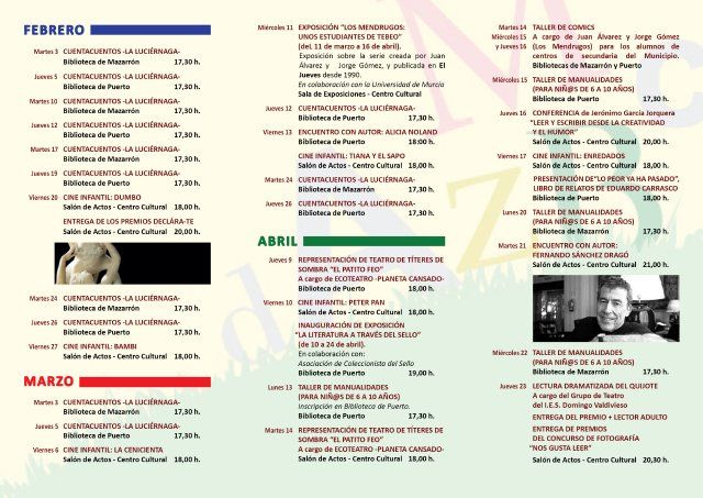 Además, todos los martes y jueves continuan los Cuentacuentos en las bibliotecas de Mazarrón y Puerto, respectivamente y vuelven los viernes de cine en el Centro Cultural con las proyecciones de temática infantil de: Dumbo (20 febrero), Bambi (27 de febrero), Cenicienta (6 de marzo), Tiana y El sapo (13 de marzo), Peter Pan (10 de abril) y Enredados (17 de abril).