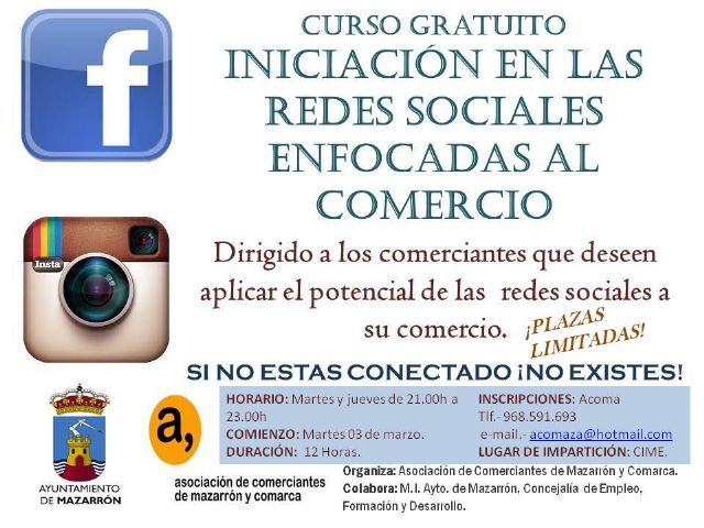 La Concejalía de Formación, Empleo y Desarrollo ha convocado un curso de iniciación a redes sociales dirigido a los comerciantes de Mazarrón. Se impartirá todos los martes y jueves de 21 a 23 horas en el Centro de Iniciativas Municipales de Empleo, situado en la Avenida de la Constitución número 65.