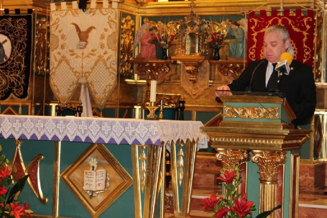 En este sentido, el edil de Cultura nombró a muchos de sus familiares y amigos cofrades cuya labor y esfuerzo "han hecho posible que la cofradía siga viva aun en estos días". Empezando por su abuelo Julián, que salvó el trono del Santo Sepulcro al esconderlo durante la Guerra Civil en el pajar de El Caño Molino para que no lo destruyesen, hasta llegar a los compañeros de las tres otras tres cofradías de Mazarrón para las que también tuvo palabras de reconocimiento a su trabajo que "unas veces nos llevaba a discusiones interminables, y otras a enriquecer nuestro patrimonio material, pero sobre todo inmaterial. Y lo que es más importante, a contribuir desde la perspectiva cofrade a propagar y acercar la Fe a todos".
