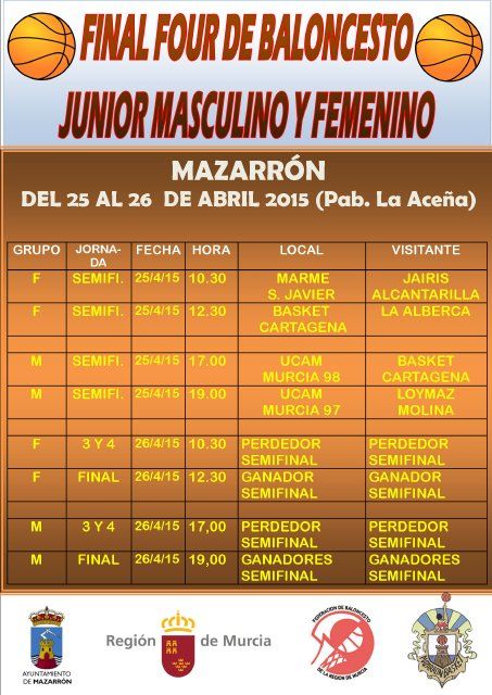 Las semifinales tendrán lugar el sábado 25 de abril. Por la mañana se disputarán los encuentros femeninos: Marme S.Javier Jairis Alcantarilla (10:30 horas) y Basket Cartagena La Alberca (12:30 horas). Por la tarde será el turno de los encuentros de categoría masculina: Ucam Murcia 98 Basket Cartagena (17:00 horas) y Ucam Murcia 97 Loymaz Molina (19:00 horas).