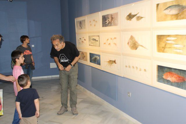 Niños y adultos han disfrutado en la mañana de este sábado de una jornada junto al prestigioso pintor de Blanca, Pedro Cano que desde el 21 de marzo expone en Casas Consistoriales una colección de acuarelas bajo el título "Peces" y en la que rinde homenaje al medio marino y a sus capturas, rememorando así detalles de su niñez cuando vendía pescado con su familia.