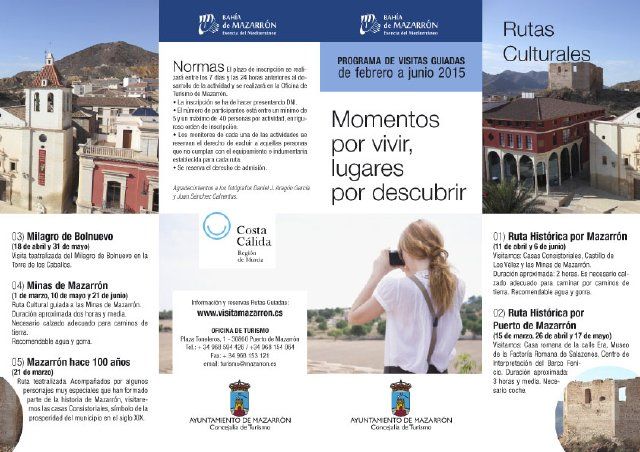 En cuanto a las rutas culturales, se trata de once visitas por los diferentes puntos de interés del municipio. Para el 17 de mayo se ha programado la Ruta Histórica por Puerto de Mazarrón incluyendo la Casa Romana de la calle Era, la Factoría de Salazones y el Centro de Interpretación Barco Fenicio. El día 31 de mayo se oferta la visita teatralizada a la Torre de los Caballos de Bolnuevo que explica el popular Milagro. Para el 6 de junio se ha programado al Ruta Histórica por Mazarrón que incluye la visita a Casas Consistoriales, Castillo de los Vélez y Minas de Mazarrón, mientras que el 21 de junio se ofrece la visita guiada exclusiva a las Minas de Mazarrón.