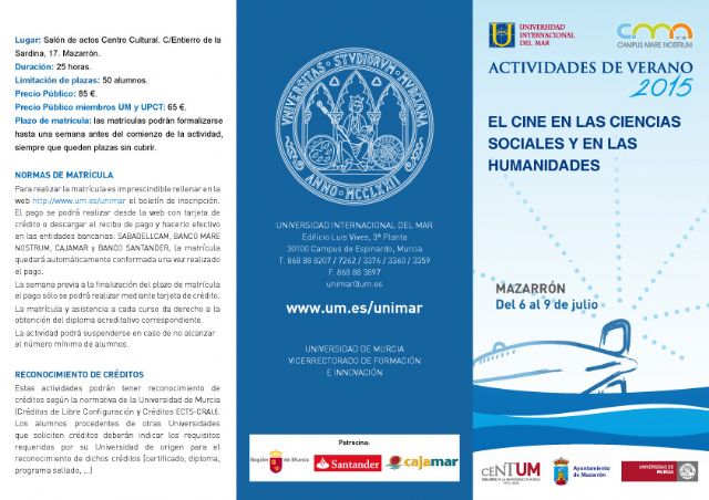 Dentro de sus actividades programadas para verano, la Universidad Internacional del Mar y el Ayuntamiento de Mazarrón han convocado para el mes de julio dos nuevos cursos. El primero de ellos se llevará a cabo entre los días 6 y 9 de julio en el Centro Cultural de Mazarrón bajo el título "El Cine en las Ciencias Sociales y en las Humanidades". Estará dirigido por los profesores Francisco Manuel García y Antonio Garrido y tendrá una duración de 25 horas, con un límite de 50 plazas. Los destinatarios son cualquier persona en general, y cinéfilos en particular.