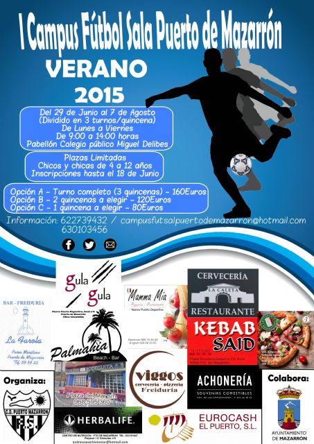 El CD Puerto de Mazarrón F.S. y el Ayuntamiento de Mazarrón han organizado para este verano el I Campus de Fútbol Sala que se desarrollará a partir del 29 de junio y hasta el 7 de agosto, divido en tres turnos por quincena. El horario será de lunes a viernes de 9 a 14 horas, en el pabellón del CEIP Miguel Delibes de Puerto de Mazarrón.