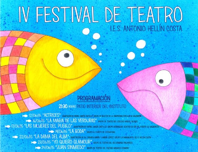Abre la programación el viernes 12 de junio el grupo de adultos de la Universidad Popular de Mazarrón con la adaptación de "Actrices", realizada por Rafael García Castillo. Continuará el martes 16 de junio el grupo de teatro del Colegio Miguel Delibes con la representación de "La magia de las verduras". Un día más tarde, el miércoles 17 de junio actuará el Grupo Atardecer del Centro de Día de Puerto de Mazarrón escenificando la obra "Las mujeres del pueblo", adaptada por Rafael García Castillo. El viernes 19 de junio será el turno para el grupo "El Cuarto de Literatura" con "La boda". El lunes 22 de junio "La Marabunta" del IES Antonio Hellín interpretará "La dama del alba", obra premiada recientemente en Murcia. El grupo de teatro del IES Domingo Valdivieso escenifica "Yo quiero Glamour", el martes 23 de junio. Cerrarán el IV Festival de Teatro los alumnos del Colegio Manuela Romero con la obra "Juan Sin Miedo".