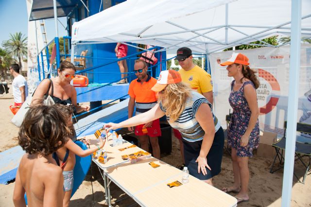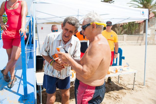 Este sábado se dio a conocer en la playa de Bahía la campaña "Disfruta de un baño seguro", una iniciativa que nace en la Dirección General de Emergencias de la Comunidad Autónoma y en la que colabora el Ayuntamiento de Mazarrón. La campaña consiste en el reparto de botellas de agua envueltas en un chaleco informativo con normas y consejos básicos para los bañistas.