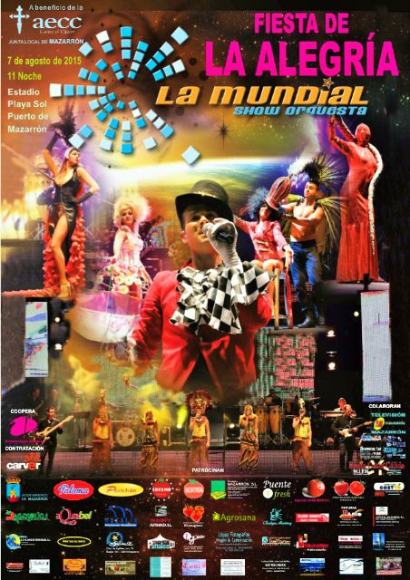Todo preparado para vivir una noche de alegría y de buenas sensaciones en compañía de una de las mejores orquestas del panorama nacional. La Mundial Orquesta Show, en colaboración con el Ayuntamiento y la Asociación Española Contra el Cáncer (AECC) traen a Mazarrón el espectáculo musical "La Fiesta de la Alegría", ambientado en las canciones más populares de los años 60, 70 y 80.