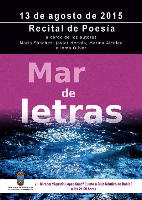 La Concejalía de Bibliotecas del Ayuntamiento de Mazarrón desea dar cabida al talento de incipientes autores locales y para ello ha organizado el primer recital de poesía "Mar de Letras". María Sánchez, Javier Hervás y Marina Alcolea protagonizan esta primera cita que tendrá lugar este jueves 13 de agosto a partir de las 21:00 horas en el mirador Agustín López Cano, junto al Club Náutico de Bahía.