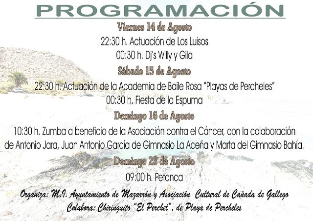 Por su parte, la Asociación Cultural de Cañada de Gallego celebra también sus fiestas de Percheles entre los días 14 y 24 de agosto. El viernes 14, a las 22:30 tendrá lugar la actuación de Los Luisos y un concierto de dj's. El sábado 15 de agosto, a las 22:30 será el turno para la Academia de Baile Rosa Playas de Percheles seguida de una fiesta de la espuma. La música continuará el domingo 16 por la mañana, a las 10:30 con un espectáculo de zumba a beneficio de la Asociación Española contra el Cáncer.