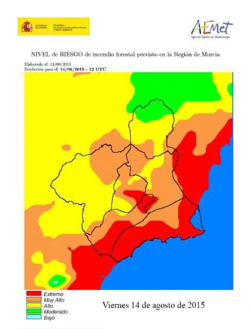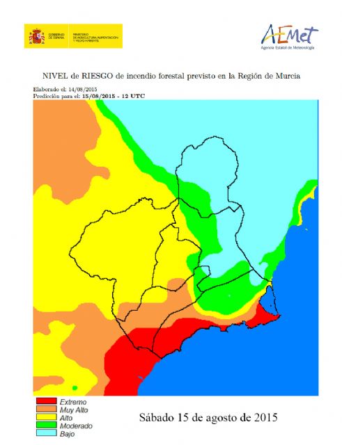La Agencia Estatal de Meteorología (AEMET) mantiene para los días 14 y 15 de agosto el aviso de riesgo extremo de incendios en toda la franja del litoral de la Región de Murcia. El aviso se basa en el estudio de los datos meteorológicos y de los modelos numéricos de predicción del tiempo. Este hecho ha obligado en la mañana de este viernes a suspender la actividad del lanzamiento solidario de farolillos a beneficio de Cáritas previsto para el sábado 15 de agosto a las 23 horas en la playa del paseo de Puerto de Mazarrón. La citada decisión se ha tomado tras una reunión de urgencia que ha congregado a miembros de Protección Civil, Policía Local, Cáritas y Ayuntamiento.