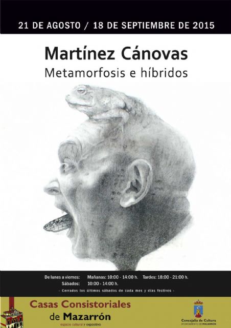 Este viernes 21 de agosto a las 20:00 horas se inaugura en Casas Consistoriales la exposición “Metamorfosis e Híbridos” del artista murciano Juan José Martínez Cánovas. El autor, ya conocido en Mazarrón, por su “Cristo Yacente” con el que rindió homenaje al pintor local Domingo Valdivieso vuelve esta vez al municipio para ofrecer un conjunto de grafitos en los que detalla, de forma surrealista, una serie de dichos populares.