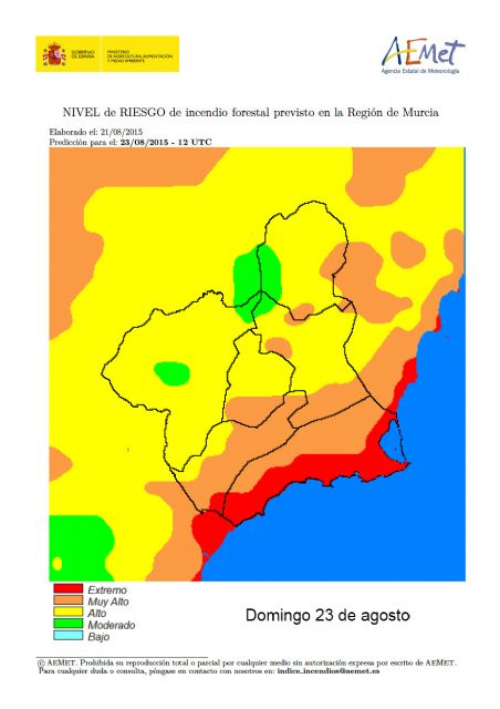 La Agencia Estatal de Meteorología (AEMET) mantiene para los días 21 y 22 de agosto el aviso de riesgo muy alto de incendios en toda la franja del litoral de la Región de Murcia. Predicción que pasa a riesgo extremo el domingo 23 de agosto. Este hecho ha obligado en la mañana de este viernes a suspender la actividad del lanzamiento solidario de farolillos a beneficio de Cáritas previsto inicialmente para el sábado 15 de agosto y que por las mismas circunstancias había quedado aplazado a este sábado 22 de agosto a las 23 horas en la playa del paseo de Puerto de Mazarrón.